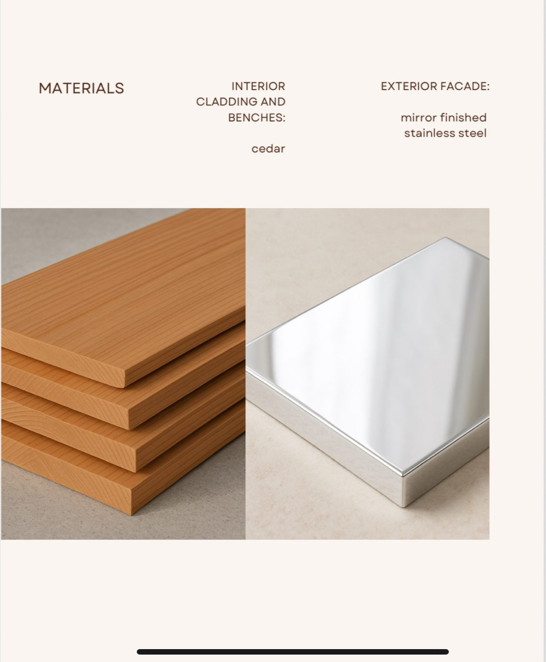 Craftsmanship * mirror finished stainless steel facade for strength and durability * Cedar interior surfaces for a natural, warm, aromatic environment